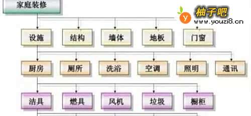 比方说这是个家庭装修项目的wbs。创建WBS是以可交付成果为对象,自上而下进行分解,越往下越详细。