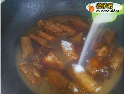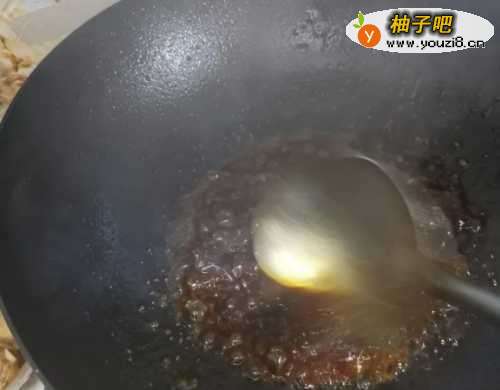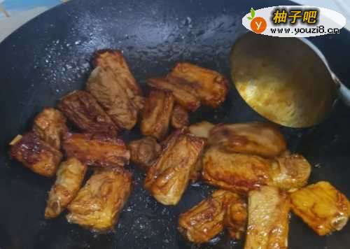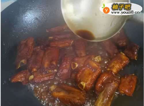 6用勺子背继续炒制,熬到出现小泡泡,又浅黄色变成深黄色。再加入一大勺陈醋煸炒,小火炒一会,排骨颜色会更漂亮。