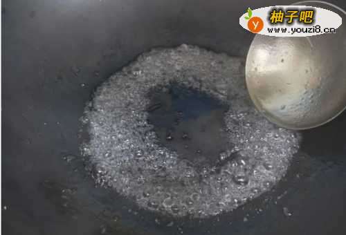 5锅洗净,再加入少许食用油,下入冰糖开始熬糖色,用勺子背轻轻把冰糖敲碎,搅动冰糖,糖融化后会出现白色的大泡泡。