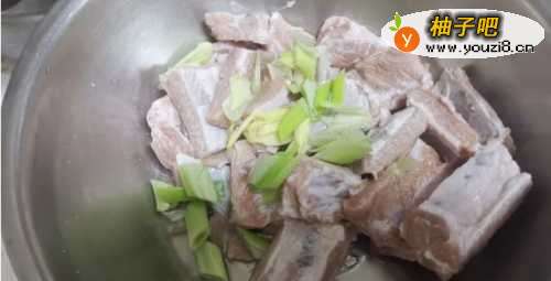 3排骨中加入葱姜,盐少许,少许料酒和五香粉,用手抓匀腌制十五分钟。