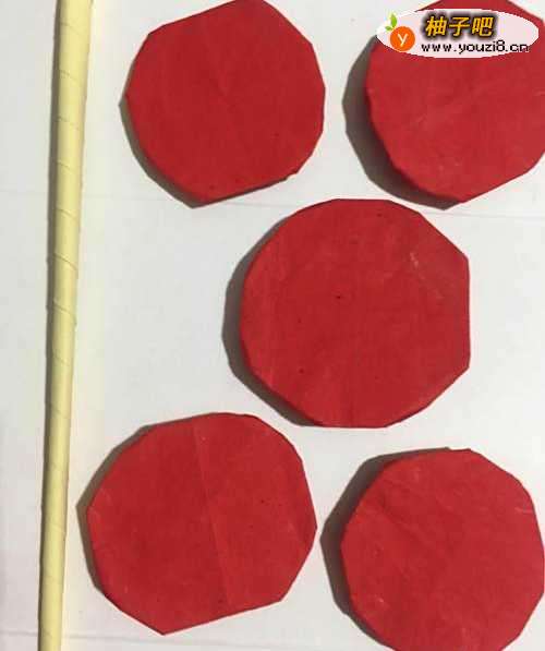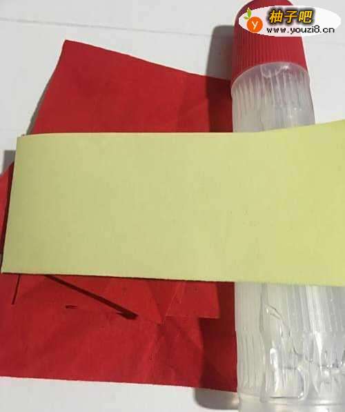 6第六步 粘完黄色彩纸条之后 在每一个冰糖葫芦 的背面 都涂上胶水 然后把每一个冰糖葫芦按大小顺序 粘在黄色细条上面就行了