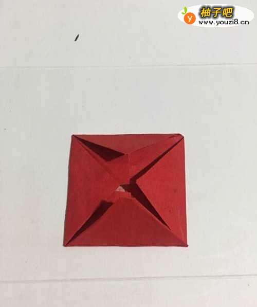 第一步 首先把一张8厘米X8厘米的正方形红色彩纸 从下向上对边折叠 然后再从右向左对边折叠