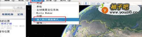 在谷歌地球的顶部的菜单栏中找到“工具”这个选项,展开,找到“进入飞行模拟模式”,点击它。