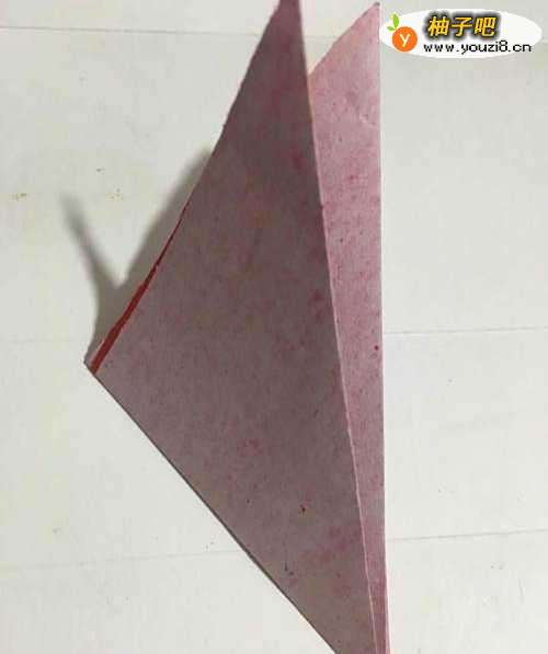 第一步 首先把一张15厘米X15厘米的红色正方形彩纸 从下向上对角折叠整齐