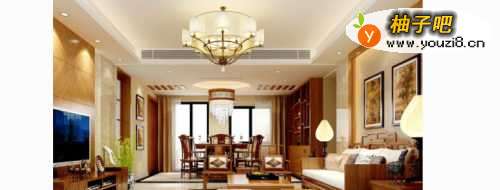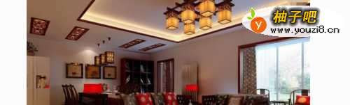 4装修中式风格,还可以从天花板的装修来营造中式风格,如下图所示,将天花板灯饰周边装成带边框的形式,与灯饰和家具相匹配,也是非常漂亮的新中式风格。