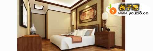6卧室装修中式风格时,同样是选用木框式线条与床头装饰画的搭配,让装饰画和灯饰的古典元素多一些,即可营造出中式装修的特点。如下图所示。