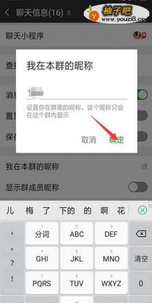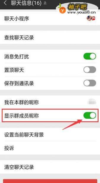 6点过确定后,我们再看下面【显示群成员昵称】,我们把后面给点成绿色的。