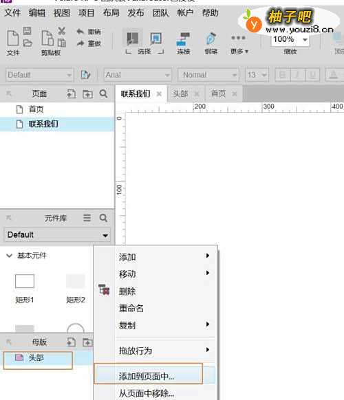 1.选择母版,按住鼠标左键不放拖入【联系我们】的页面中
