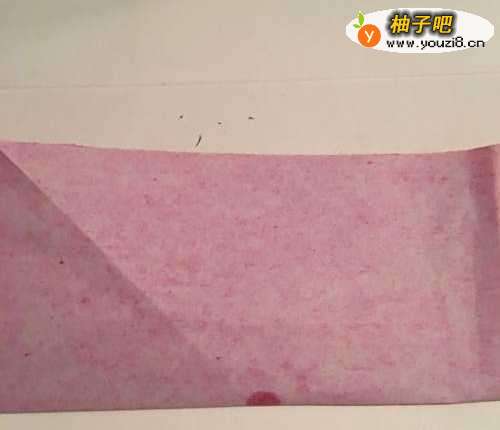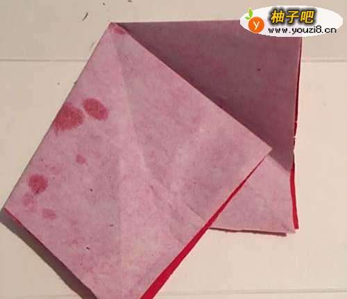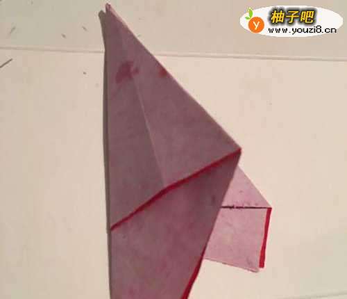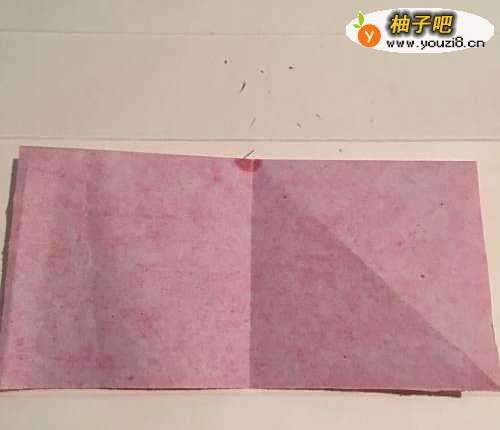 第一步 首先把一张16厘米X16厘米的红色彩纸 从下向上折叠整齐