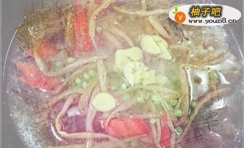 干山药用开水泡软,滤干;胡萝卜切片;豌豆剥壳,洗净;干黄花泡软,滤干备用。