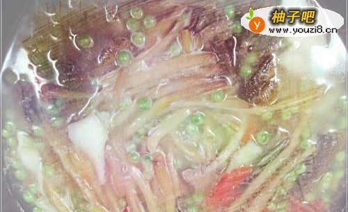 去除汤面的泡沫后,再加入备好的山药、胡萝卜、黄花和豌豆。拌匀,盖上锅盖烧开。