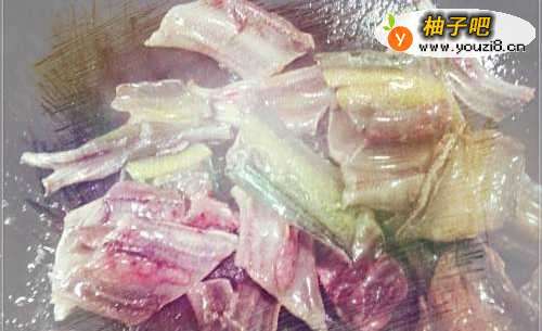 破开黄蟮,去除内脏 市场上卖的都是活的黄蟮,最好买时让商家加工好。杀黄蟮要比杀鱼难得多,主要是黄溜,灵活,很难抓住。商家有专门工具,先把蟮鱼摔晕,然后钉住头,用专门小刀一划就破开啦,内脏一下就清理干净啦。