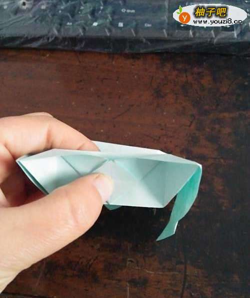 10我们把一侧的角按照折痕向内折,然后把大拇指的小角向上折。