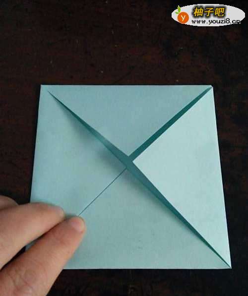 3然后我们把两条对角线对折,然后打开后把四个角向内折如图。