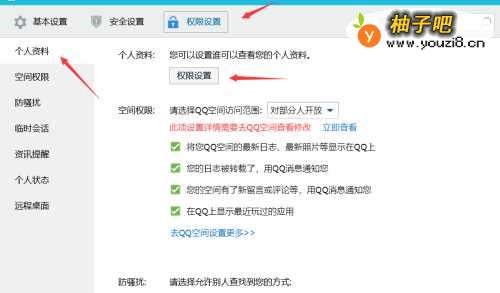 5再在“个人资料”,在这里可以设置谁能看到你的个人资料,在这里找到“权限设置”;