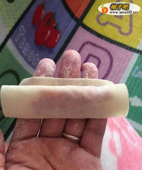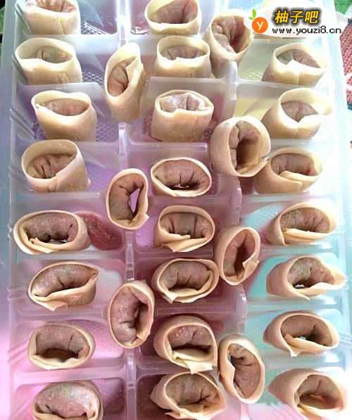 3接着,顺着肉泥的宽度,把云吞皮往内(大概三分之一的位置)折一折;