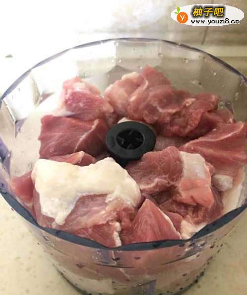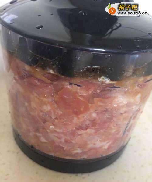 3材料放入完毕就可以开动绞肉机进行1分钟的搅拌,不一会肉泥就做好了;