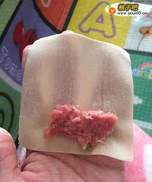 2首先,拿一块云吞皮在手指上摊开,把肉泥混入一些葱花后放一点在云吞皮的一侧;