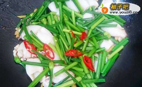 7放入韭菜花和红辣椒,与小管一同大火急炒。