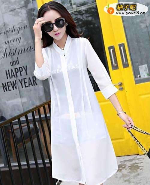 搭配七:豆沙色雪纺裙+白色防晒衣豆沙色是最近两年特别特别流行的,这款豆沙色雪纺裙是非常淑女的,搭配一件白色防晒衣,温婉大方又能起到防晒的作用。