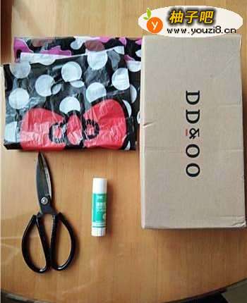 将所需要用到的材料准备好,如鞋盒,好看的包装袋,剪刀,固体胶。