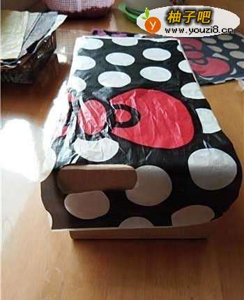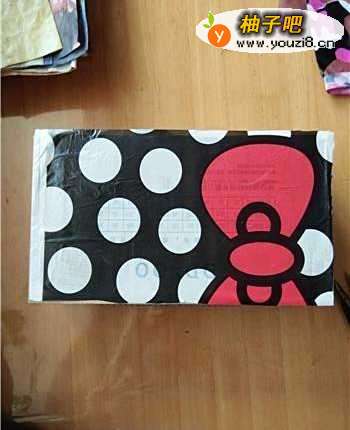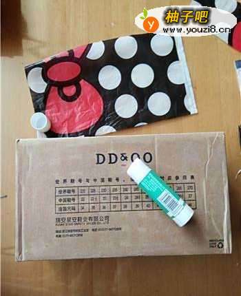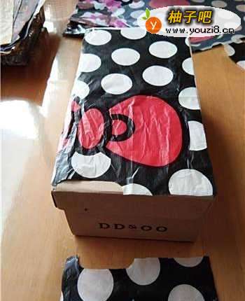8然后将固体胶均匀的涂抹在鞋盒底部,将裁剪好的包装袋粘贴上去,既简单有美观的鞋盒装饰方法就完成了。