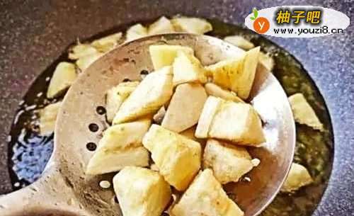 4蒜切成末,炒锅留底油烧热,先把蒜末倒进去炒出香味,然后倒入调好的糖醋汁,中小火炒到汤汁变稠,倒入炸好的茄子块,快速翻炒,使每一块茄子都裹上糖醋汁,然后就可以关火了。