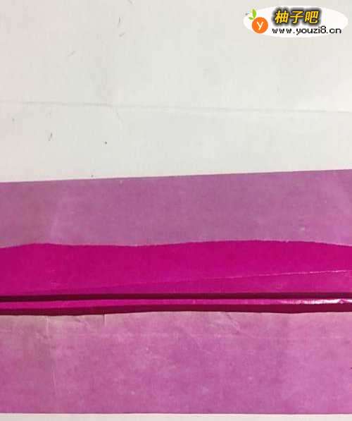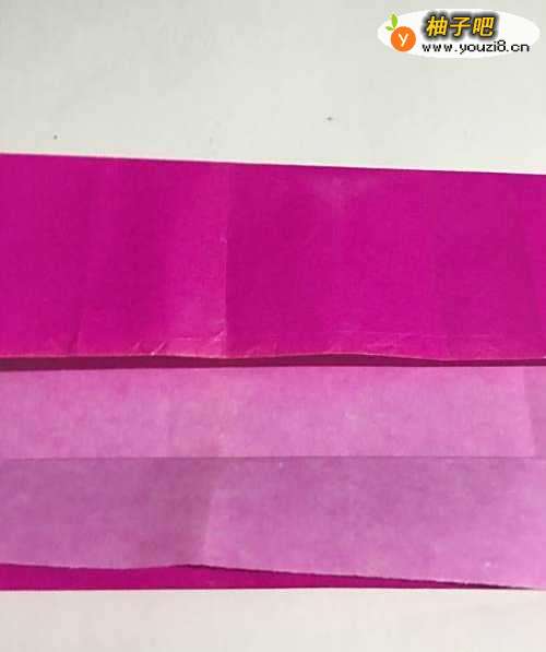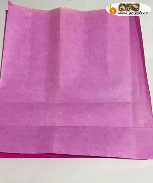 第一步 首先把一张长27厘米 宽15厘米的长方形二红色彩纸竖起来 从下向上对折后取开