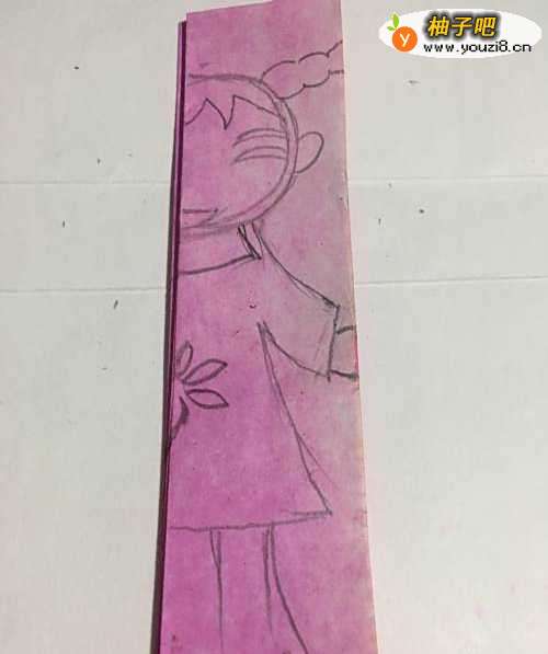 5第五步 对折完之后 竖起来 拿起绘图铅笔 在上面画上半个小女孩的图案