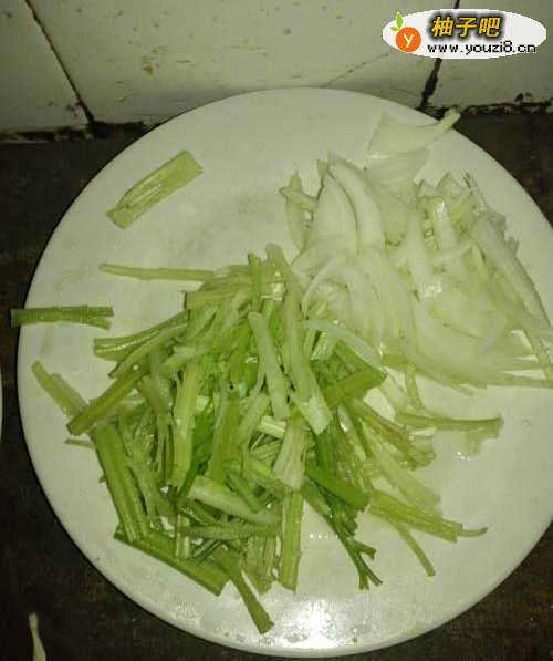 2将鸡肉切丝,水泡!加淀粉抓匀!锅放油划开!