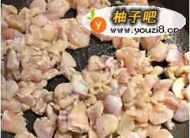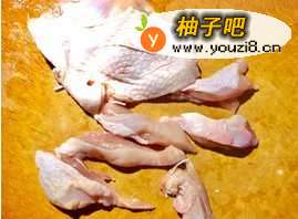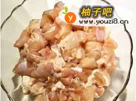 2去掉皮内侧的肥油,将鸡腿肉切成小块