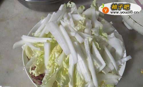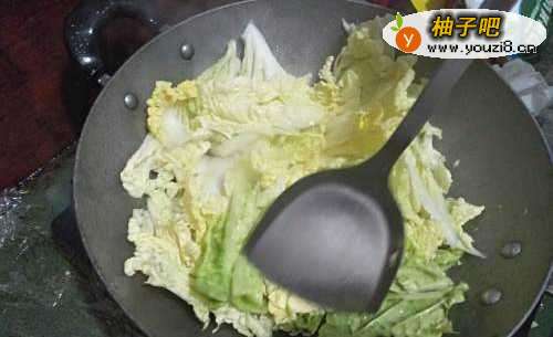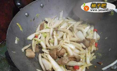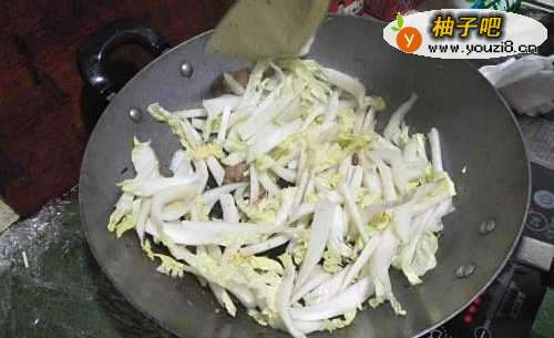 4然后加入大白菜梆子,因为菜梆比较难熟,所以先炒一下菜梆。