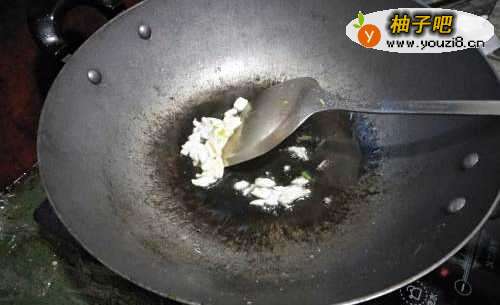 2然后倒入食用油,加入切碎的蒜瓣炒香。