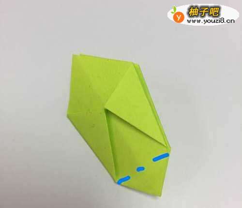 将正方形的一个角折到中间的对角线出,形成六边形的样子。翻到另一面,同样折成六边形。