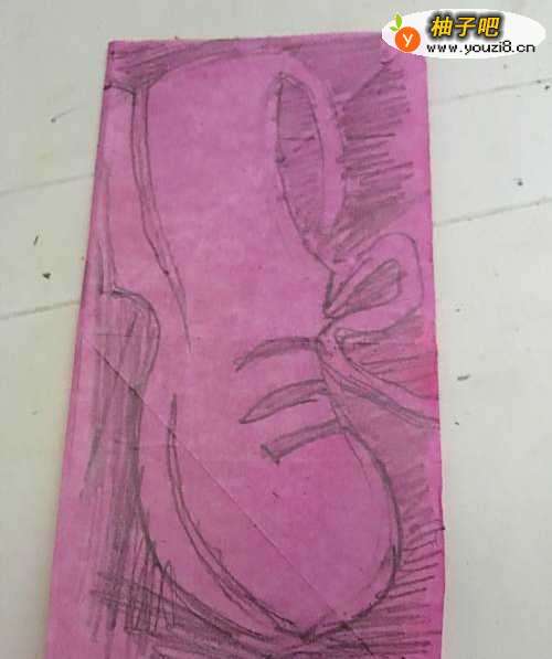 2第二步 折叠完之后 把它竖起来 双边在左 拿起绘图铅笔画上大头鞋的草图外线轮廓