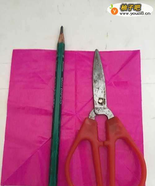 第一步 把一张16厘米X16厘米的正方形二红色彩纸 从下向上对边折叠整齐