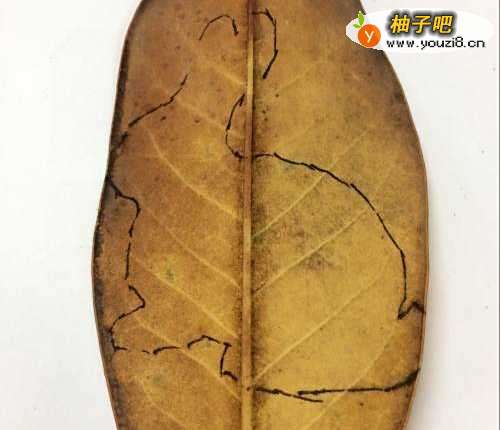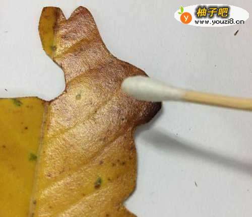 3把叶子翻过来,看看剪的小兔的轮廓像不像,如果还行就继续下面的工作,如果觉得不好,就重新再剪一个,反正捡回来的树叶也有很多的。