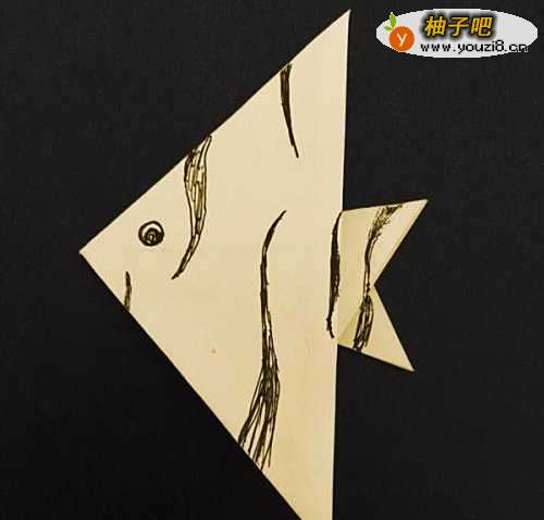 7用笔在上面画上小鱼的眼睛以及身上的花纹,这样一只可爱的小鱼就折好了。