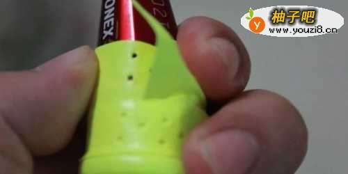 揭开手胶尖头的双面胶,此处是手胶开头的地方,把手胶整齐的一边对着羽毛球拍底部,开始缠绕。