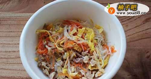 10将肉丝、胡萝卜丝倒进刚才煎好的鸡蛋丝里,再把生抽、粉丝、盐、香油倒进去搅拌均匀