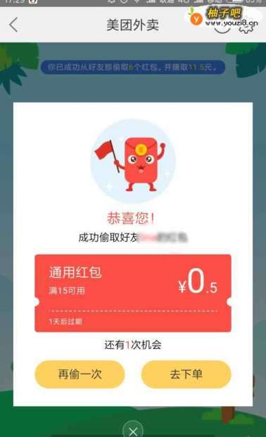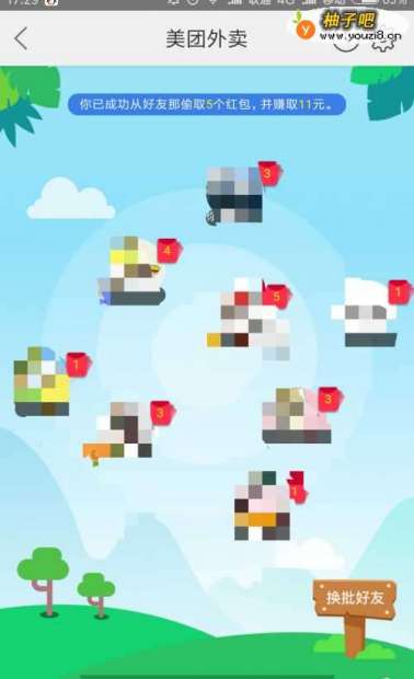 3我们选择其中一个好友的头像点击,这时候就会提示我们偷取成功。每个人一天有两次机会可以拿到微信好友的外卖,如果好友没有,可以选择换一批。
