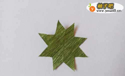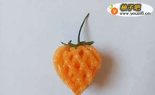 7将铁丝包上皱纹纸做叶柄,将蒂固定,插在草莓中间的缝中。