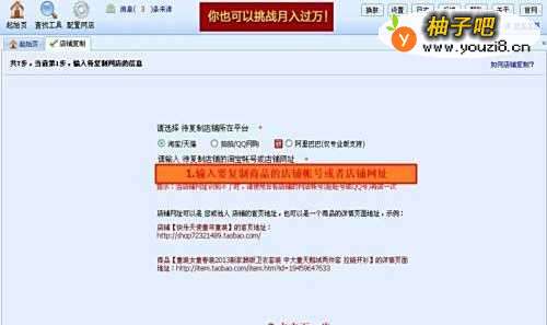 如复制淘宝店铺的商品,请输入店铺地址,然后点击“下一步”,如下图所示: