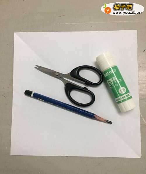 准备一张正方形的纸和笔纸、胶水剪刀。
