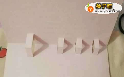 3用笔在彩纸上对中间线为对称轴,左边画两条六公分长的直线,往右每隔一段距离画两条四公分长的直线,每两条直线之间宽度为一公分。