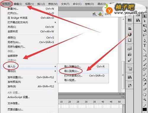 Flash窗口中,单击文件---->导入---->导入到库,导入一张背景图片。