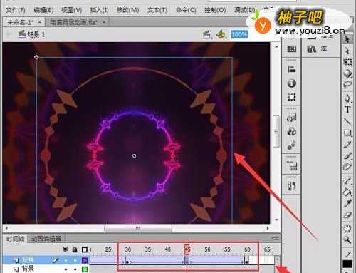 9用同样的方式在第30、45和60帧处添加关键帧,并设置图形的大小和透明度,并添加补间动画。