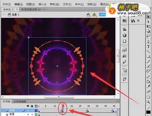 7第15帧处插入一个关键帧,改变圆圈图形的大小和透明度。