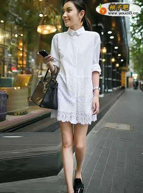 8整体H型的款式,衬衫从腰线以下加了蕾丝拼接,这样凸显了腰线,另外长款白衬衫适合将袖子卷起来,整体看着会很协调。