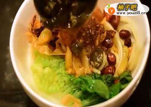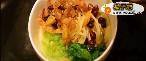 8将粉丝煮熟后用漏勺过滤掉水,然后将粉丝放到碗中,并且将之前煮熟的青菜、花生米和豆皮黄花菜也放入碗中。如下图所示